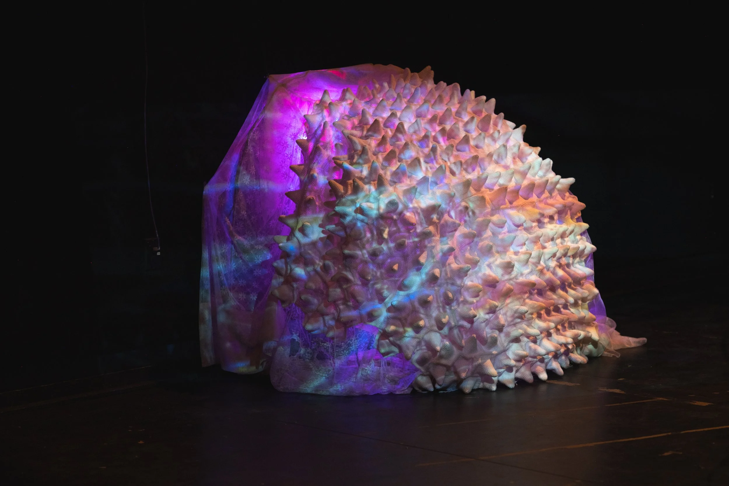2.2 Yuki LN’s multisensorial sculptural workドキドキeternal calm〜!! explores how natural technologies evolve under environmental stressors. Inspired by the evolution of the structure of snowflakes under climate change, Yuki LN constructs a structure that transcends traditional classification, a structure that is both electronic and organic, eternal and alive. The sculpture reacts to the presence of its viewers, creating a being that hybridizes and morphs under the pressure of human presence.